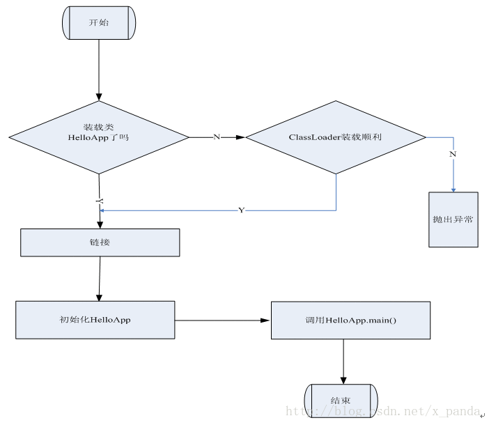 开始试图执行类HelloApp的main方法,发现该类并没有被装载,也就是说虚拟机当前不包含该类的二进制代表,于是虚拟机使用ClassLoader试图寻找这样的二进制代表。如果这个进程失败,则抛出一个异常。类被装载后同时在main方法被调用之前,必须对类HelloApp与其它类型进行链接然后初始化。链接包含三个阶段:检验,准备和解析。检验检查被装载的主类的符号和语义,准备则创建类或接口的静态域以及把这些域初始化为标准的默认值,解析负责检查主类对其它类或接口的符号引用,在这一步它是可选的。类的初始化是对类中声明的静态初始化函数和静态域的初始化构造方法的执行。一个类在初始化之前它的父类必须被初始化。整个过程如下: