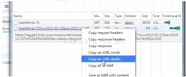 curl'https://kaggle2.blob.core.windows.net/competitions-data/kaggle/4438/UserInfo.tsv.7z?sv=2012-02-12&se=2015-12-10T16%3A26%3A05Z&sr=b&sp=r&sig=olOI7lwDgKKXFFYmpYXalphxKjFfDa5uQ5w7rIcMQGo%3D'-H 'Accept-Encoding: gzip, deflate, sdch' -H 'Accept-Language: zh-CN,zh;q=0.8'-H 'Upgrade-Insecure-Requests: 1' -H 'User-Agent: Mozilla/5.0 (Windows NT 6.1;WOW64) AppleWebKit/537.36 (KHTML, like Gecko) Chrome/47.0.2526.73Safari/537.36' -H 'Accept:text/html,application/xhtml+xml,application/xml;q=0.9,image/webp,*/*;q=0.8' -H'Referer: https://www.kaggle.com/c/avito-context-ad-clicks/data' -H'Connection: keep-alive' --compressed -o 1.7z 重定向到1.7z