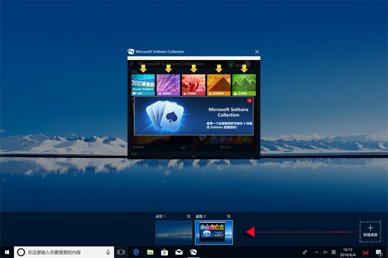 除此之外,在“多任务视图”界面的右下角还有一个“新建桌面的选项,点一下就可以新建一个桌面。这个功能可是十分贴心实用的说,通过它,你就可以实现办公桌面和个人桌面的彻底分开。